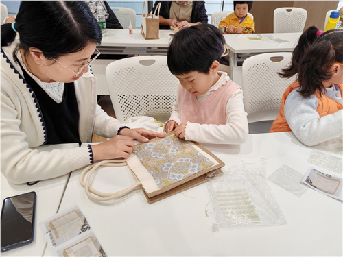活动中,馆员为读者们科普了宋锦的历史起源、制作工艺、艺术特色等等,并采用知识问答的形式检验了读者们的学习成果,大家积极踊跃地抢答问题,现场热闹非凡。最后,馆员带领大家共同制作了宋锦珍珠包,结合课堂上所学“宋锦讲究图案对称、精美的特征”,现场读者纷纷发挥自我创造力,通力合作将宋锦裁剪了各式各样的图形,并缀以珍珠,制作出了一个个精美的宋锦珍珠包。