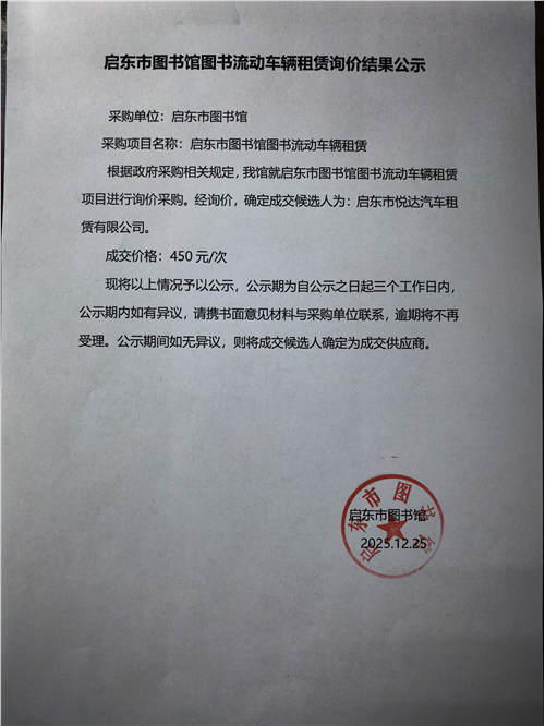 启东市图书馆图书流动车辆租赁询价结果公示